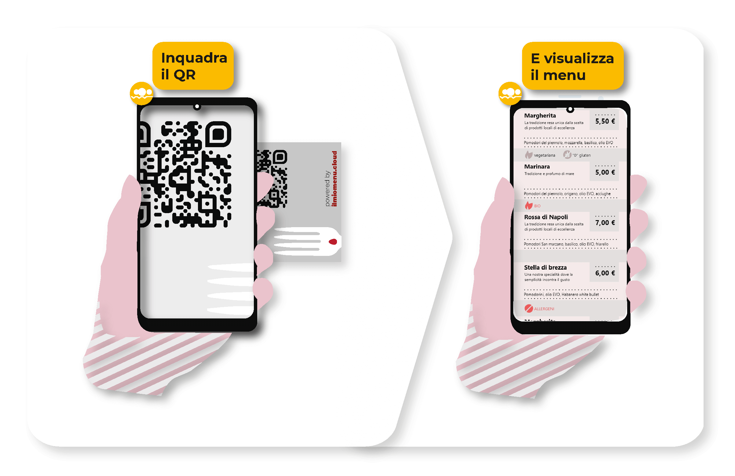 Non devi convincere i tuoi clienti fidelizzati o potenziali a scaricare e installare una nuova App. Ilmiomenu.cloud è usufruibile via web. I tuoi clienti potranno consultarlo in tempo zero